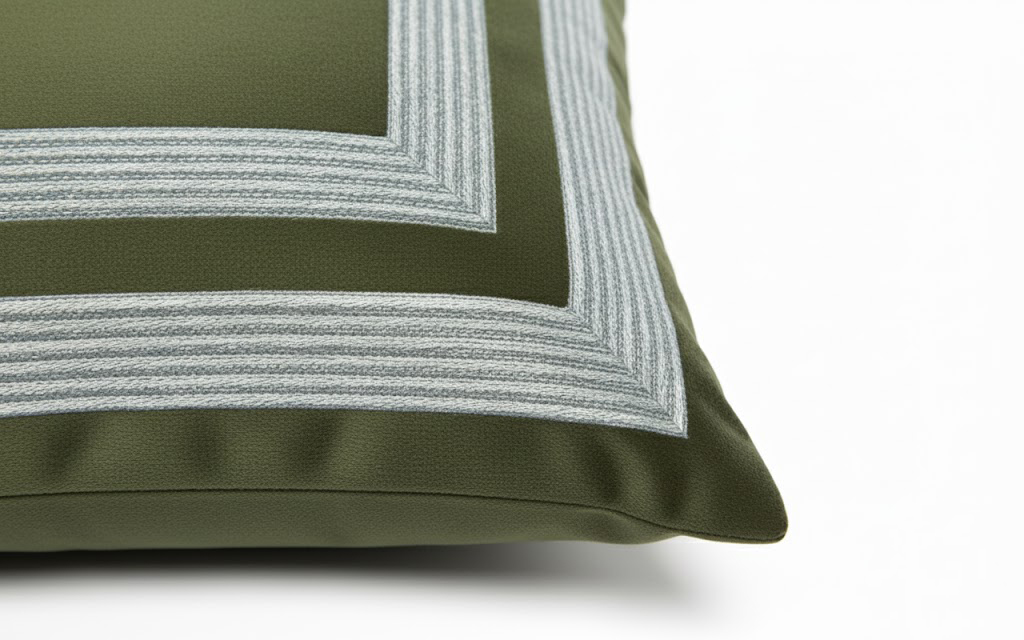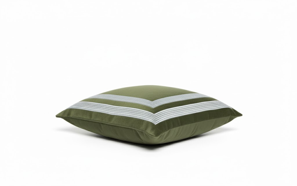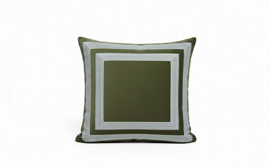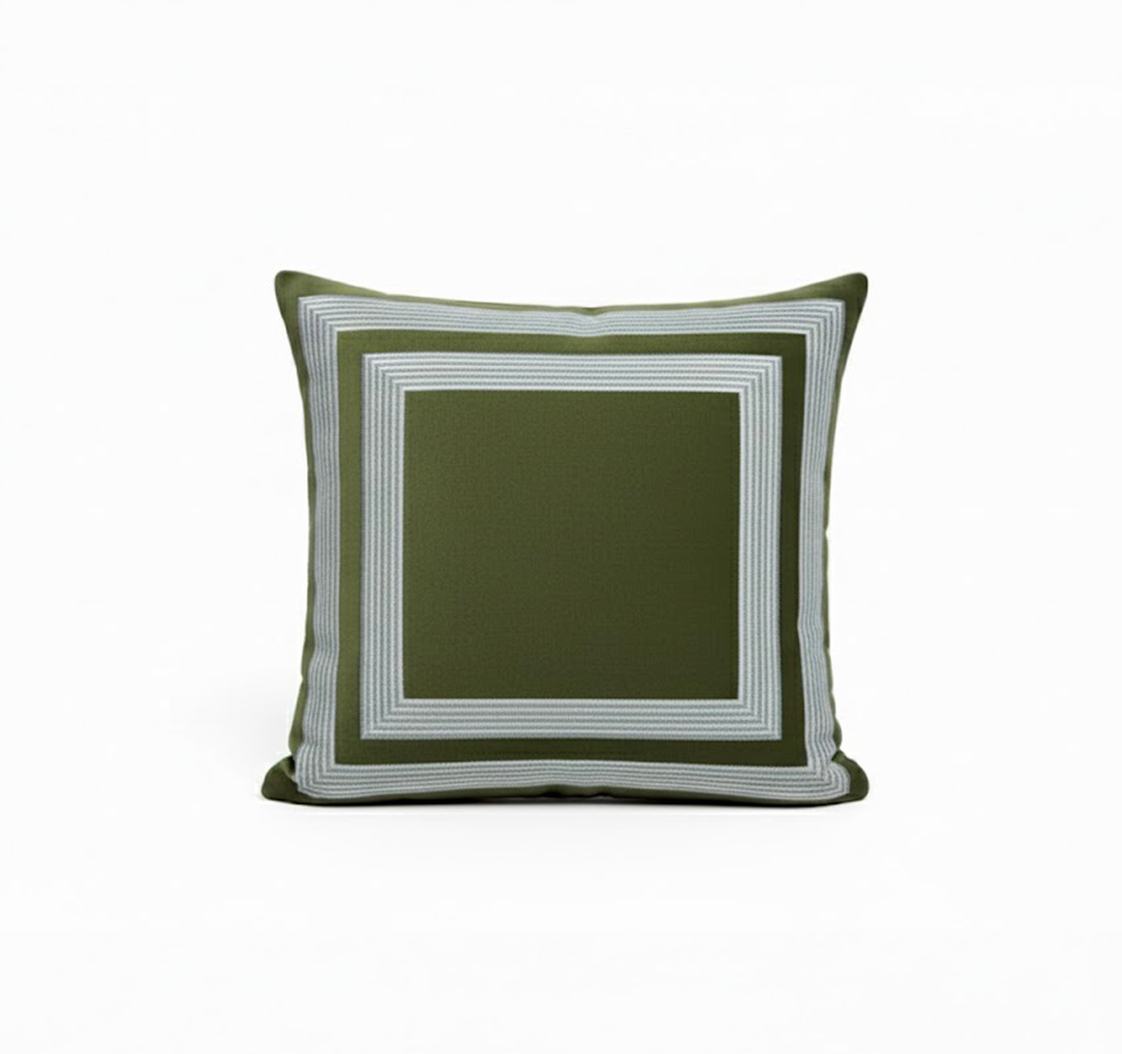 • Galon décoratif : galon plat formant deux carrés concentriques, appliqué avec précision sur le devant du coussin. Sa teinte argentée apporte un accent graphique et lumineux, structurant la surface et créant une profondeur visuelle.