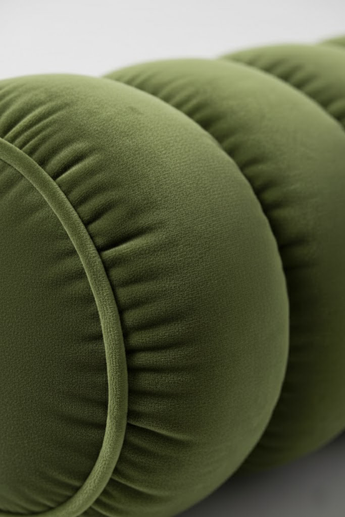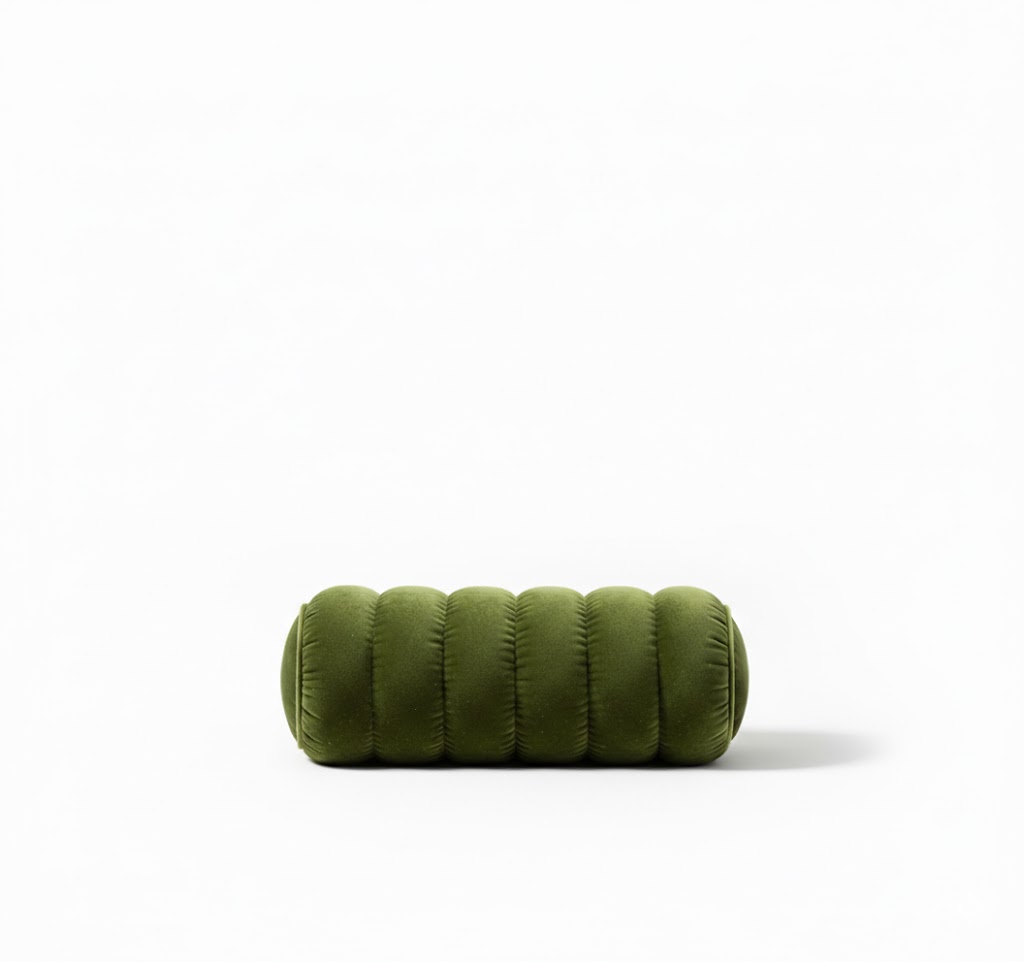 Le coussin La Ronde se distingue par sa forme cylindrique raffinée et sa construction matelassée en segments rembourrés, offrant un relief tridimensionnel et une texture luxueuse. Revêtu d’un velours vert olive profond, chaque boudin est sculpté avec précision pour créer une silhouette organique et harmonieuse, alliant confort et élégance.