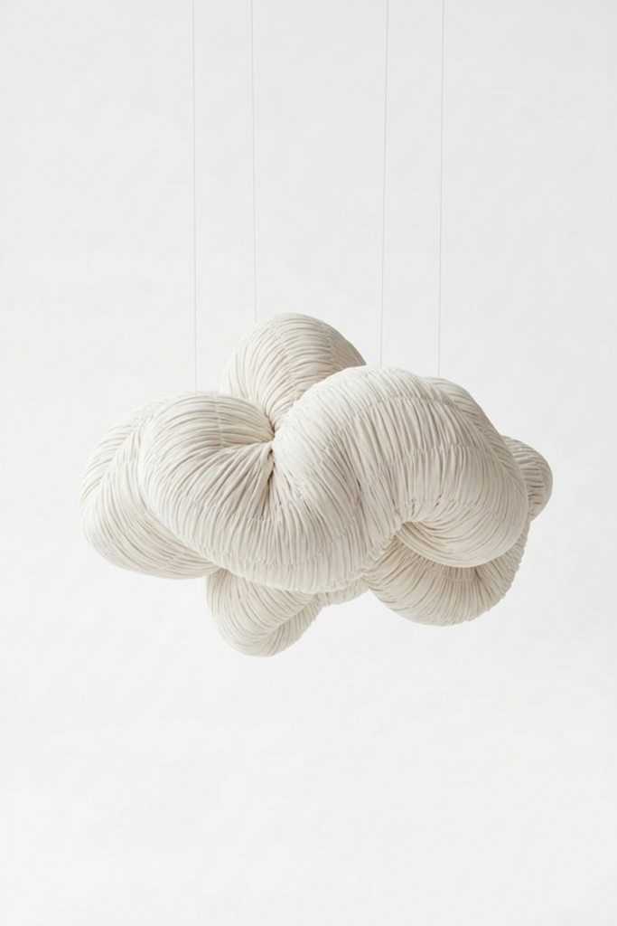 L’emblématique plissé Le Smock s’élève et se déploie dans les airs. Cette structure suspendue libère le textile de toute contrainte pour en révéler la légèreté architecturale. Travaillé en volume, le plissé main devient une parure aérienne qui sculpte la lumière et redéfinit les hauteurs sous plafond.