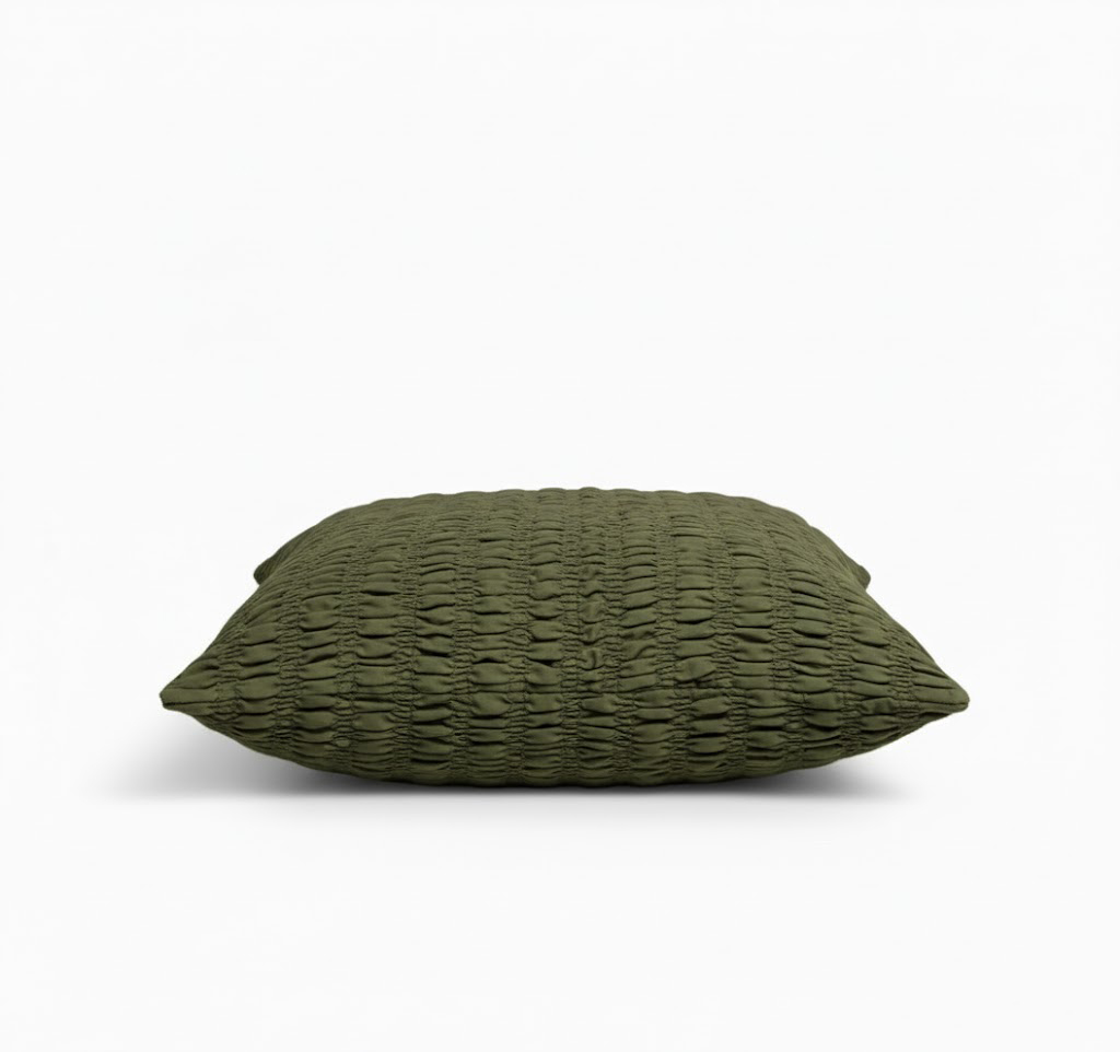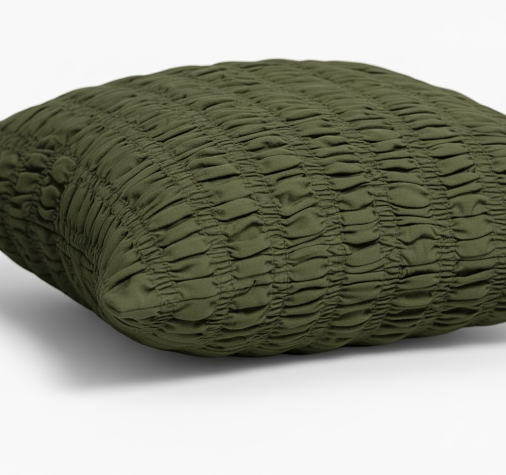 Le coussin Le Smocke se distingue par son satin de laine vert kaki profond, travaillé intégralement par un smockage raffiné. Cette technique traditionnelle confère au coussin un volume généreux et une texture tridimensionnelle, offrant à la fois souplesse, confort et une présence visuelle marquée.