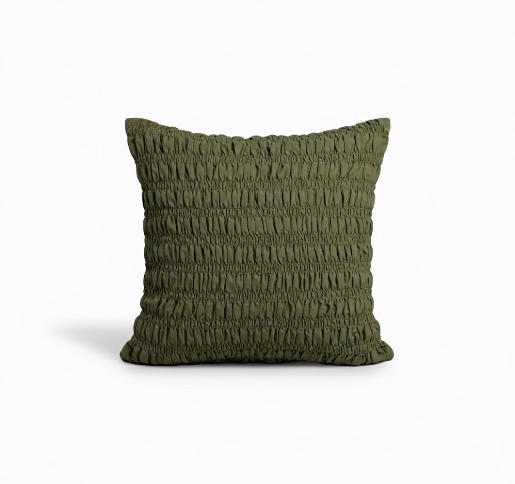 • Détail couture : exécuté avec précision, couvrant l’intégralité de la surface visible et conférant au coussin un relief élégant. Technique de smockage : réalisation en bandes horizontales très serrées, créant des plis réguliers et un relief uniforme sur toute la face du coussin. Cette densité procure souplesse et profondeur visuelle.