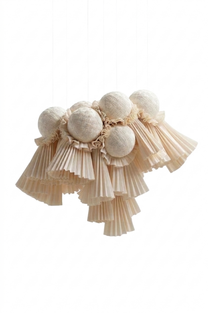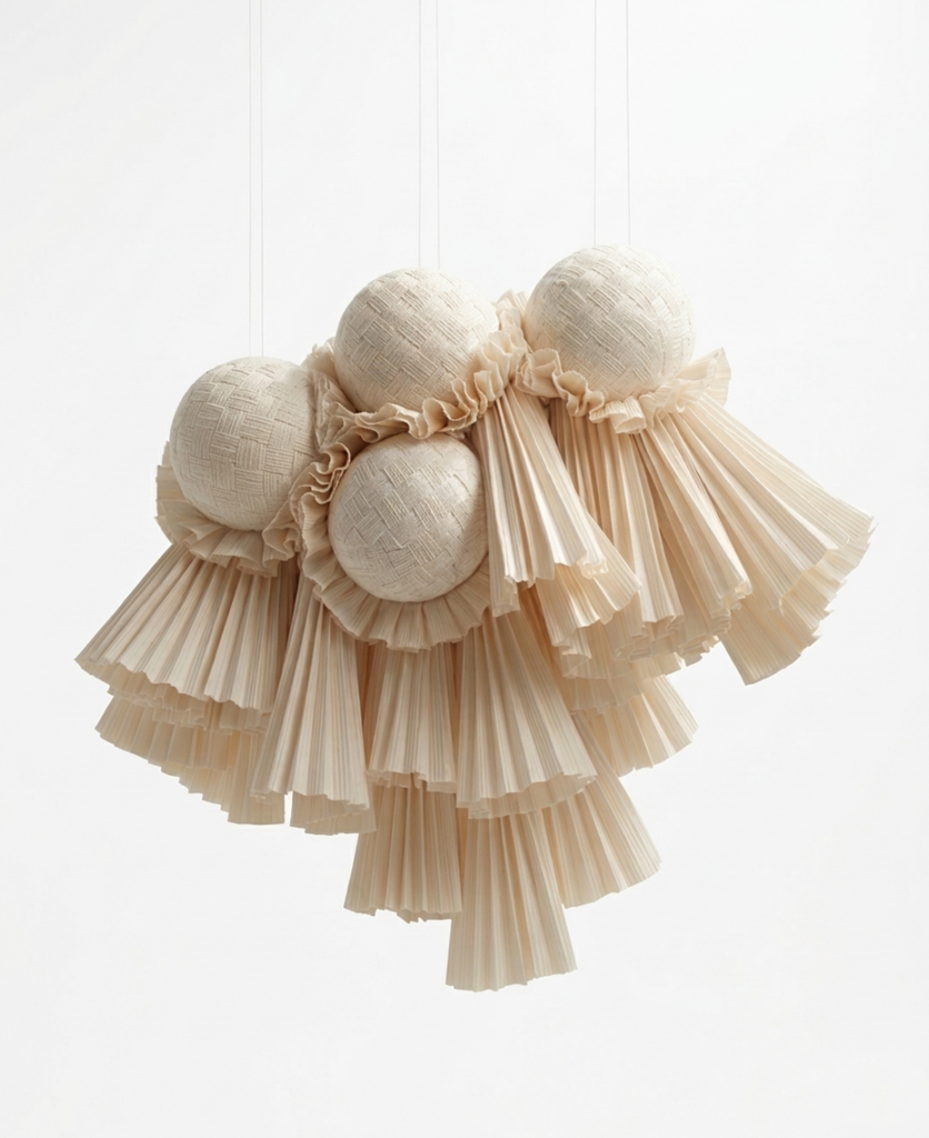Cette pièce délicatement luxueuse se déploie avec une élégance silencieuse, conçue pour sublimer l’architecture qu’elle habite. Un travail de gainage d’une extrême finesse qui transforme le textile en un réceptacle de lumière pur et captivant.