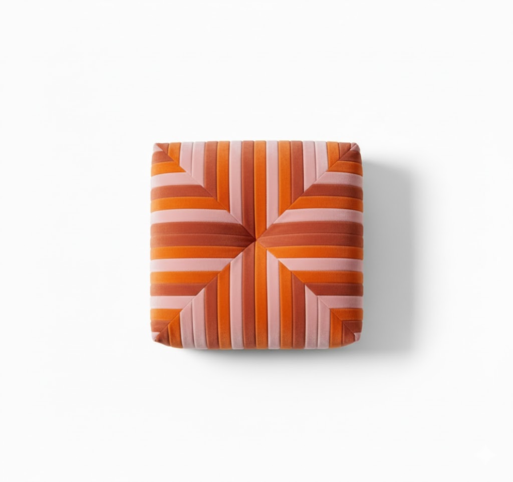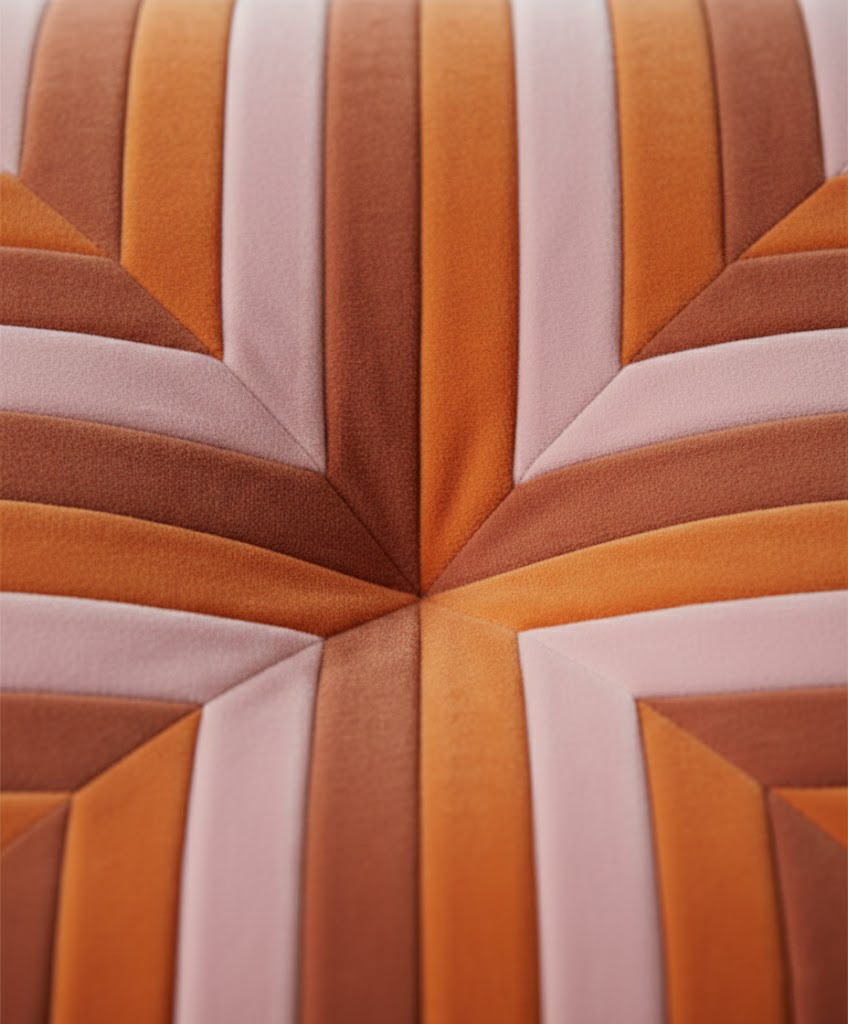 • Détail couture : chaque bande de velours est cousue et matelassée individuellement, puis le matelassage converge vers un capitonnage central qui aplatit légèrement la surface et crée un dessin étoilé concave vu du dessus, garantissant maintien et harmonie des volumes.