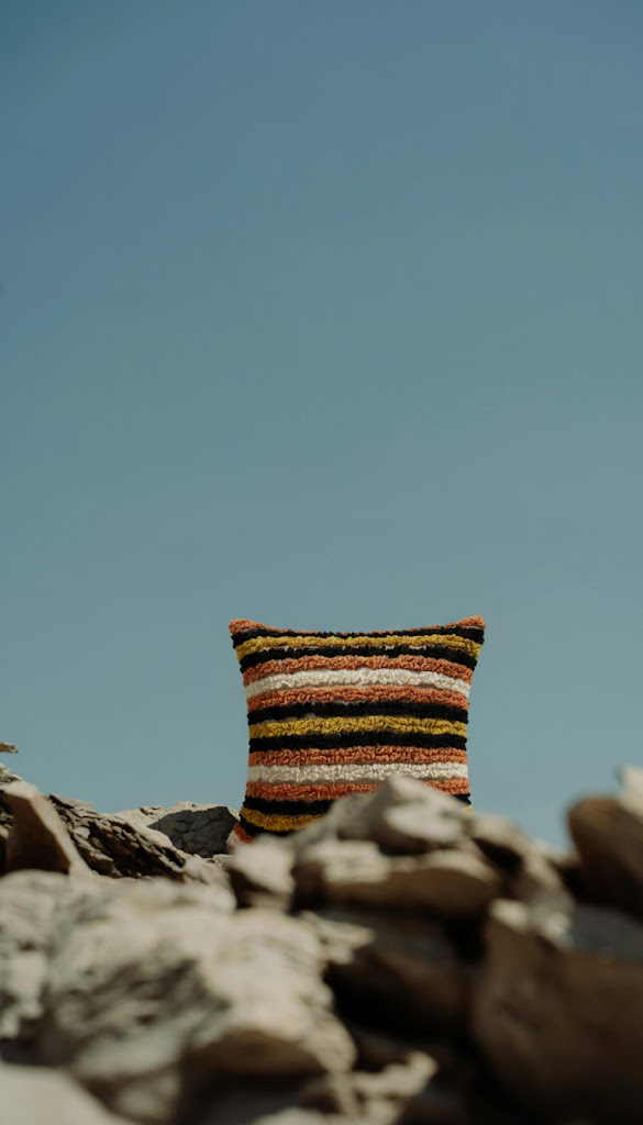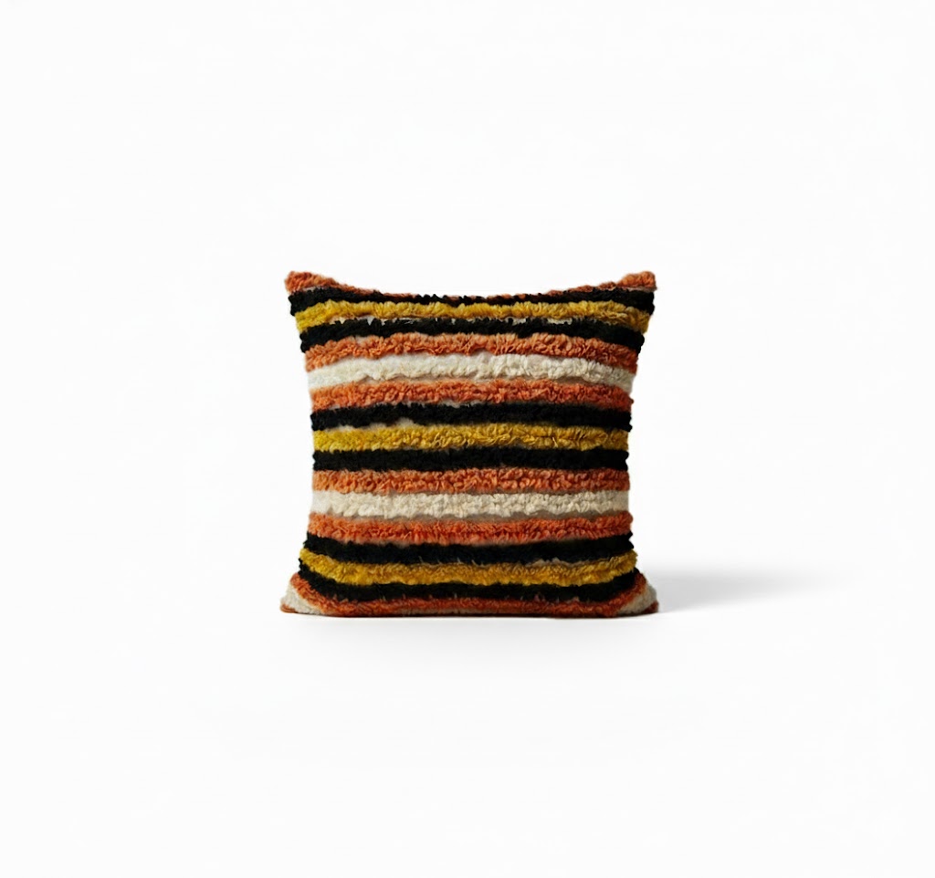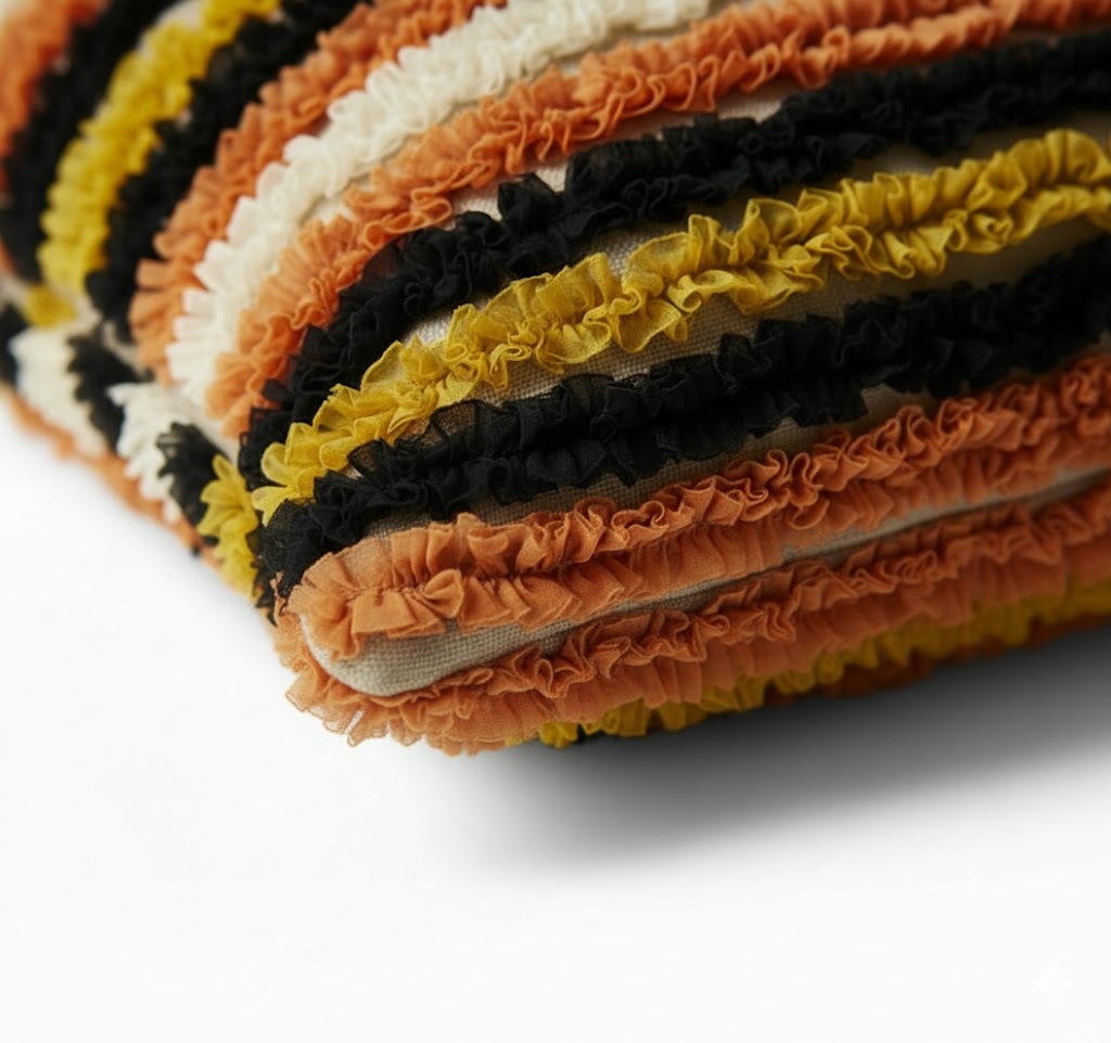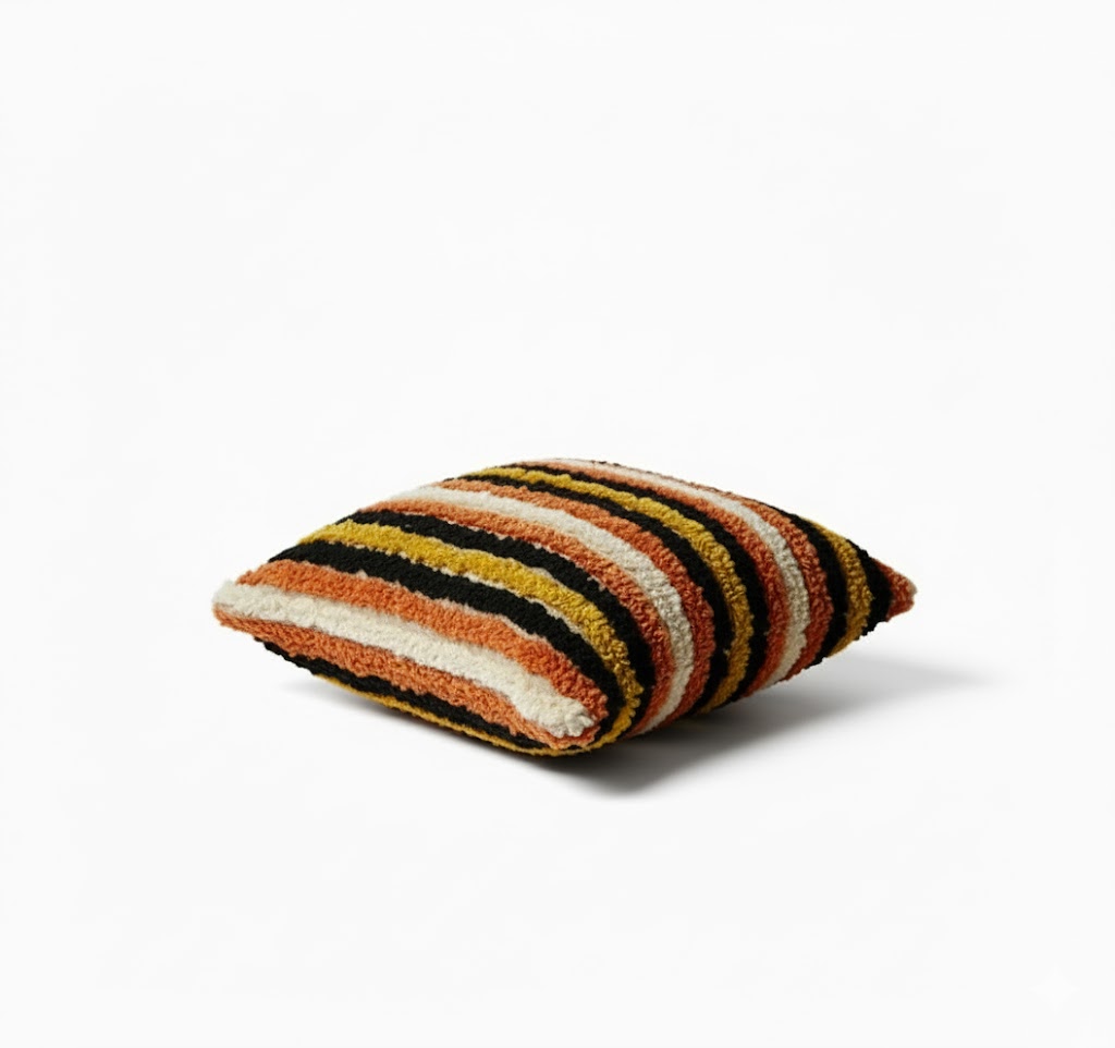 • Détail couture : bordures discrètes et soignées, mettant en valeur le travail artisanal du tissu et de la couleur, garantissant tenue et durabilité. Les bandes colorées sont cousues avec soin pour maintenir régularité, volume et finesse, chaque fronce participant à la densité et à la souplesse du coussin.